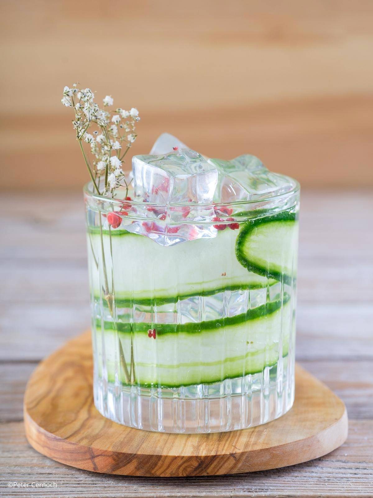 Quarter the cucumber slice and gently squeeze it into your glass. Pour all the ingredients into the highball glass over ice cubes (4 to 5) and mix everything together. Finally, perfume and garnish it with a lemon zest. Cheers, Julius