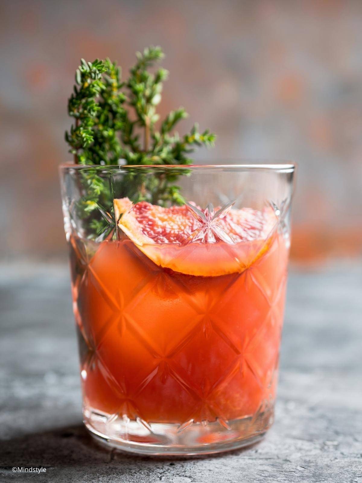 Wash the grapefruit with hot water, dry it off, cut in half and further into smaller pieces. Pour all ingredients over ice into a tumbler, add the grapefruit slices and mix everything together. Cheers, Julius